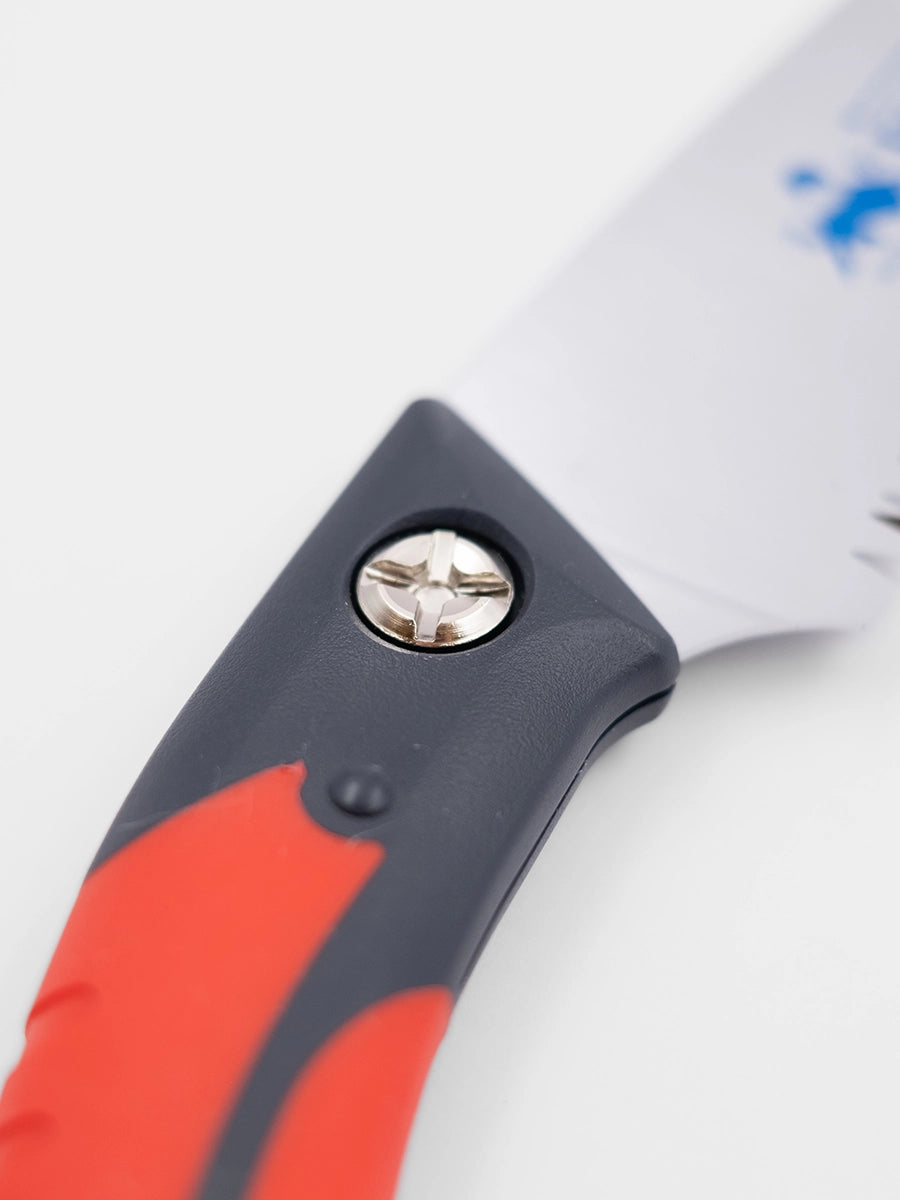 Scie d’élagage équipée d’une *lame courbe qui saisit fermement la branche et offre une puissance de coupe exceptionnelle, idéale pour l’abattage d’arbres (non adaptée au travail du bois).