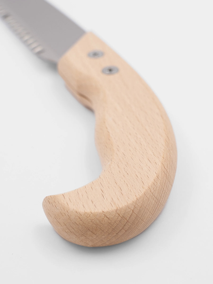 Le manche en bois, ergonomique et antidérapant même avec la transpiration, gagne en caractère avec l’usage. Livrée avec un étui pratique à fixer à la ceinture, pour toujours l’avoir à portée de main.
