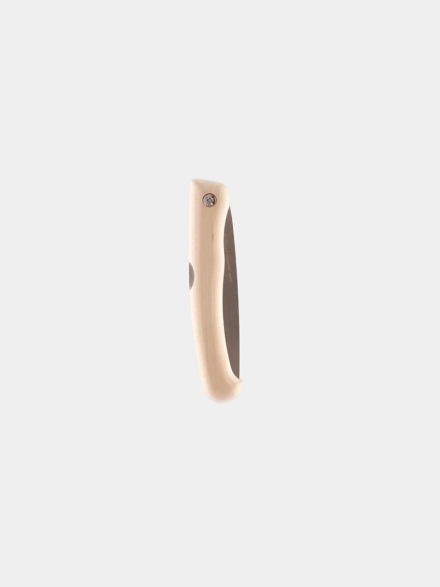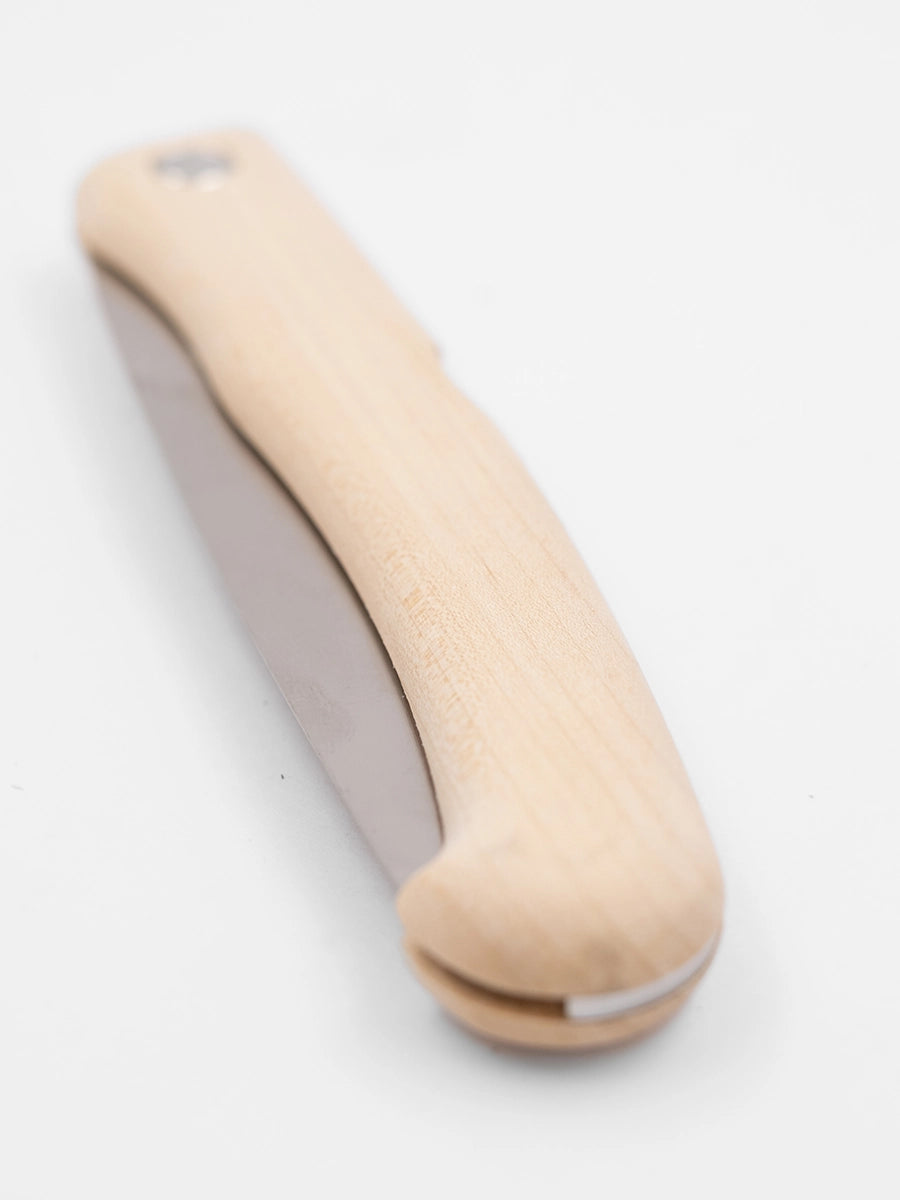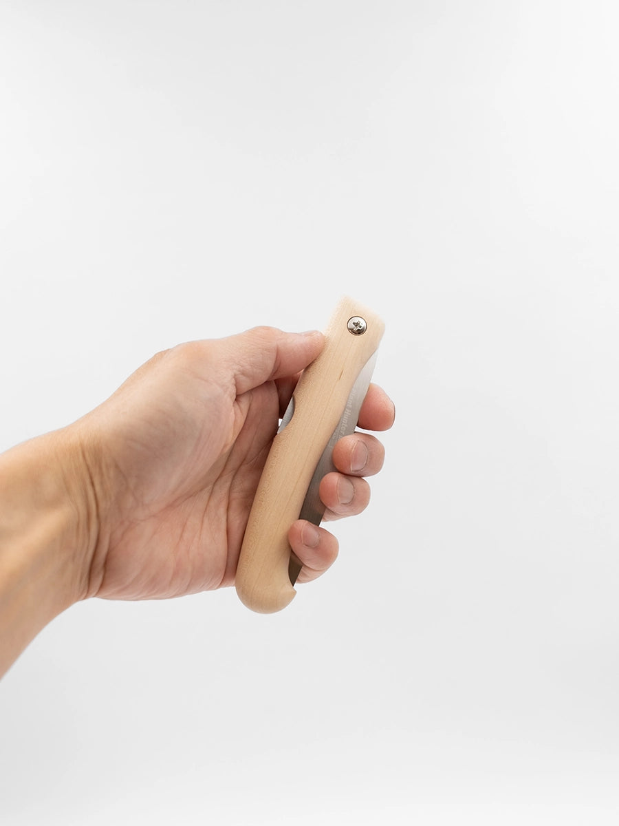 Le manche en bois, ergonomique et antidérapant même avec la transpiration, gagne en caractère avec l’usage.